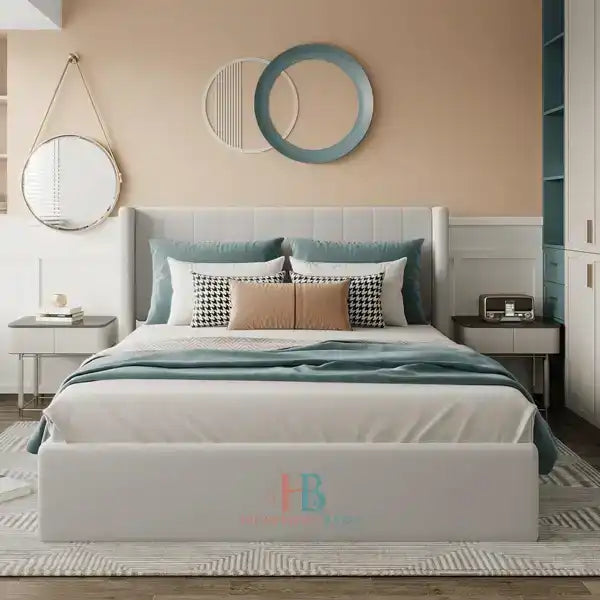 A wingback bed frame is a stylish luxury bed frame that features a tall, padded headboard with "wings" extending from either side. These wings often curve slightly inward, giving the bed a luxurious and cosy appearance. Wingback bed frames are typically upholstered in fabric, velvet and they come in various colors and textures to suit a range of bedroom interior.