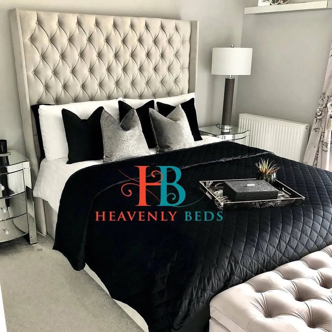 Wingback king size bed frame in mink plush velvet made Heavenlybeds